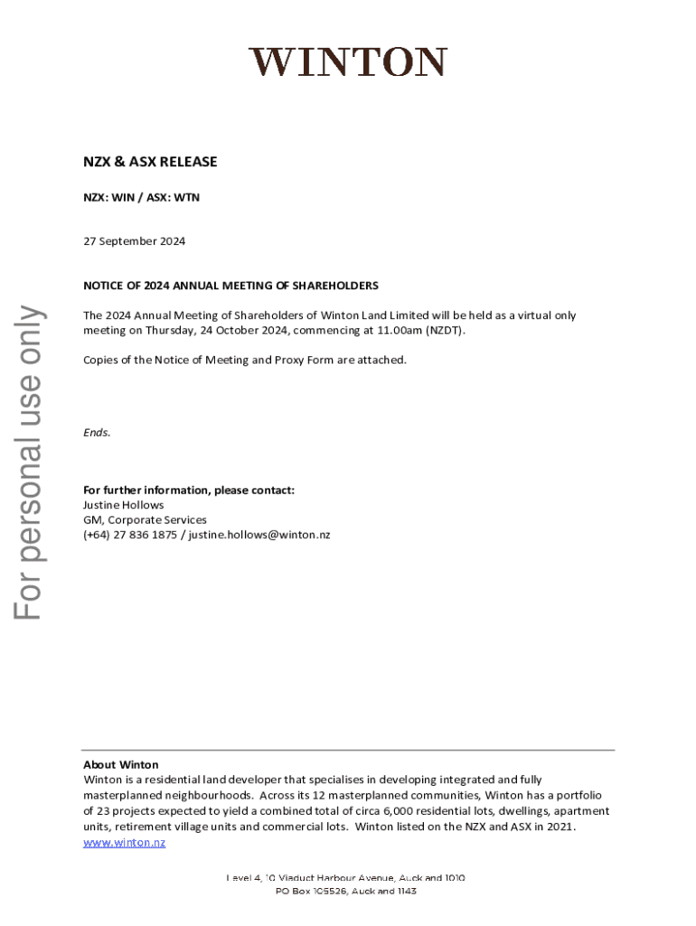 NZX & ASX RELEASE NZX: WIN / ASX: WTN 27 September 2024For personal use onlyNOTICE OF 2024 ANNUAL MEETING OF SHAREHOLDERS The 2024 Annual Meeting of Shareholders of Winton Land Limited will be held