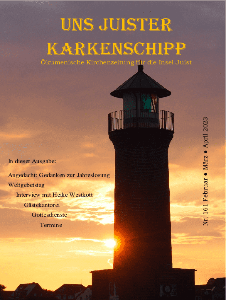 UNS JUISTER KARKENSCHIPPIn dieser Ausgabe: Angedacht: Gedanken zur Jahreslosung Weltgebetstag Interview mit Heike Westkott Gstekantorei Gottesdienste TermineNr. 161 Februar Mrz April 2023kumenische