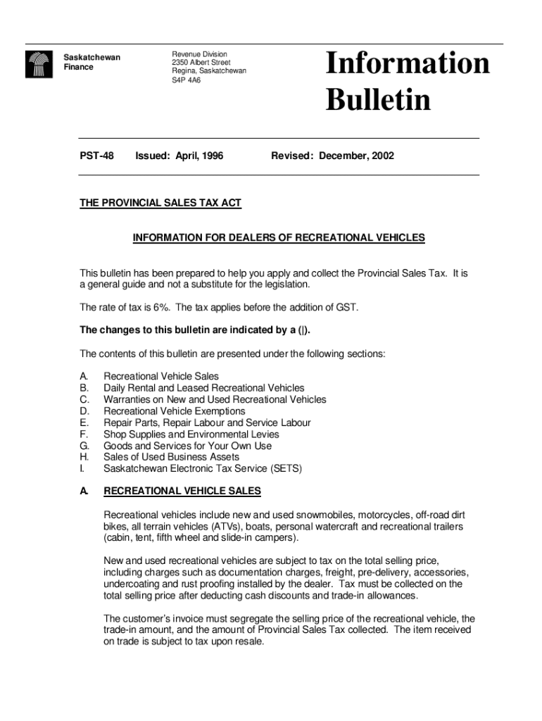Saskatchewan FinancePST48Information BulletinRevenue Division 2350 Albert Street Regina, Saskatchewan S4P 4A6Issued: April, 1996Revised: December, 2002THE PROVINCIAL SALES TAX ACT INFORMATION FOR