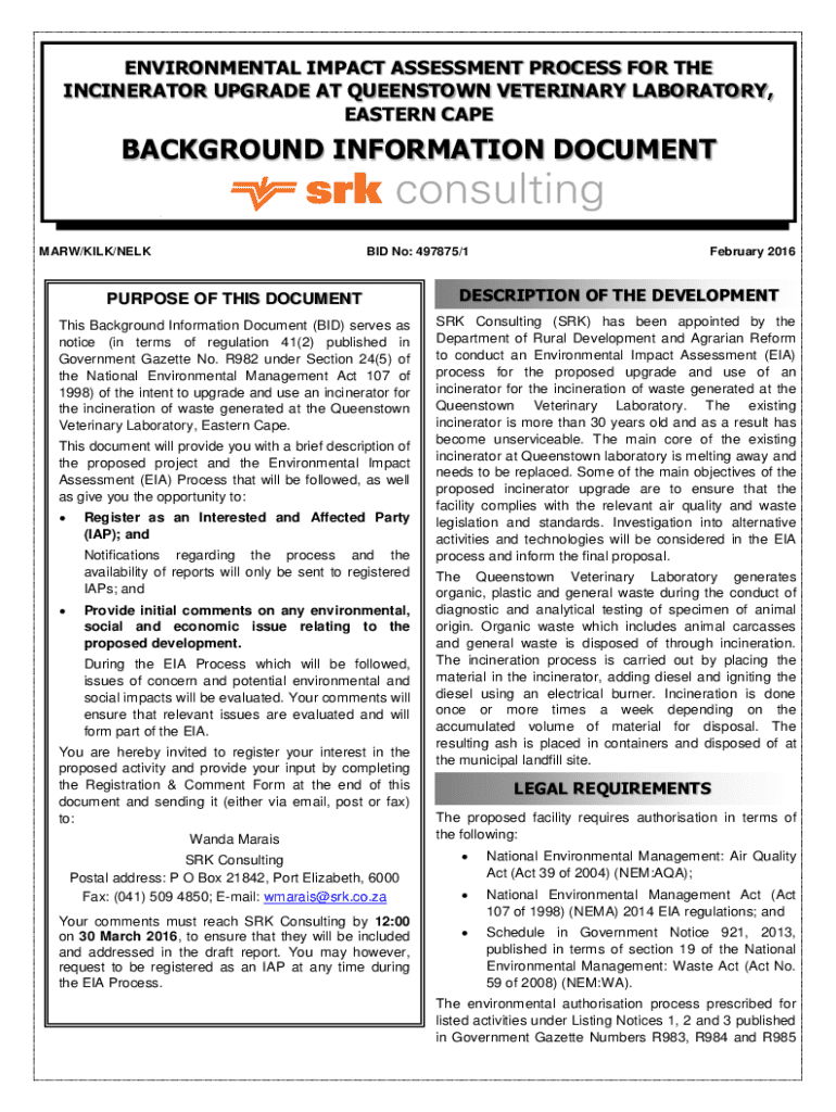 This Background Information Document outlines the intent to upgrade and use an incinerator at the Queenstown Veterinary Laboratory for waste incineration. It includes details about the Environmental Impact Assessment (EIA) process, opportunities for public participation, and the relevant legal requirements regarding environmental legislation.