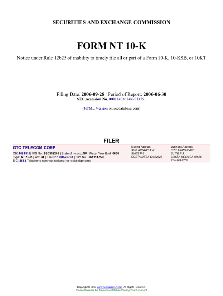 This document serves as a notification to the Securities and Exchange Commission (SEC) regarding GTC Telecom Corp\'s inability to file its Form 10-K for the period ended June 30, 2006, due to the unavailability of data and financial statements without unreasonable effort or expense.