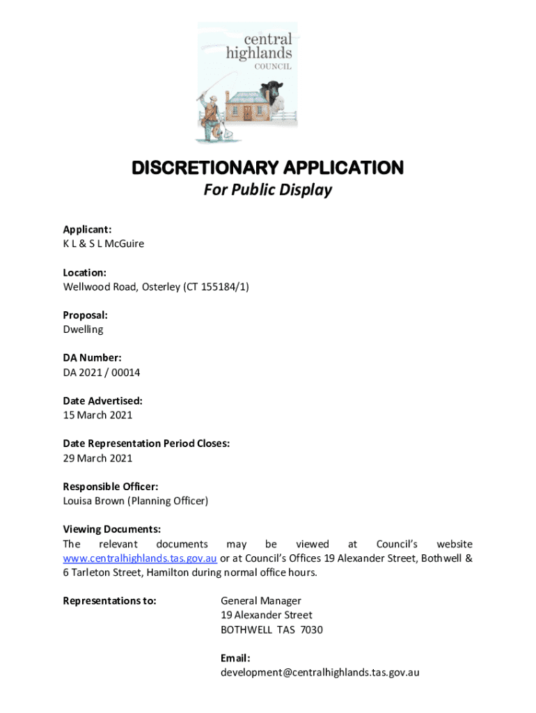 DISCRETIONARY APPLICATION For Public Display Applicant: K L & S L McGuire Location: Wellwood Road, Osterley (CT 155184/1) Proposal: Dwelling DA Number: DA 2021 / 00014 Date Advertised: 15 March 2021