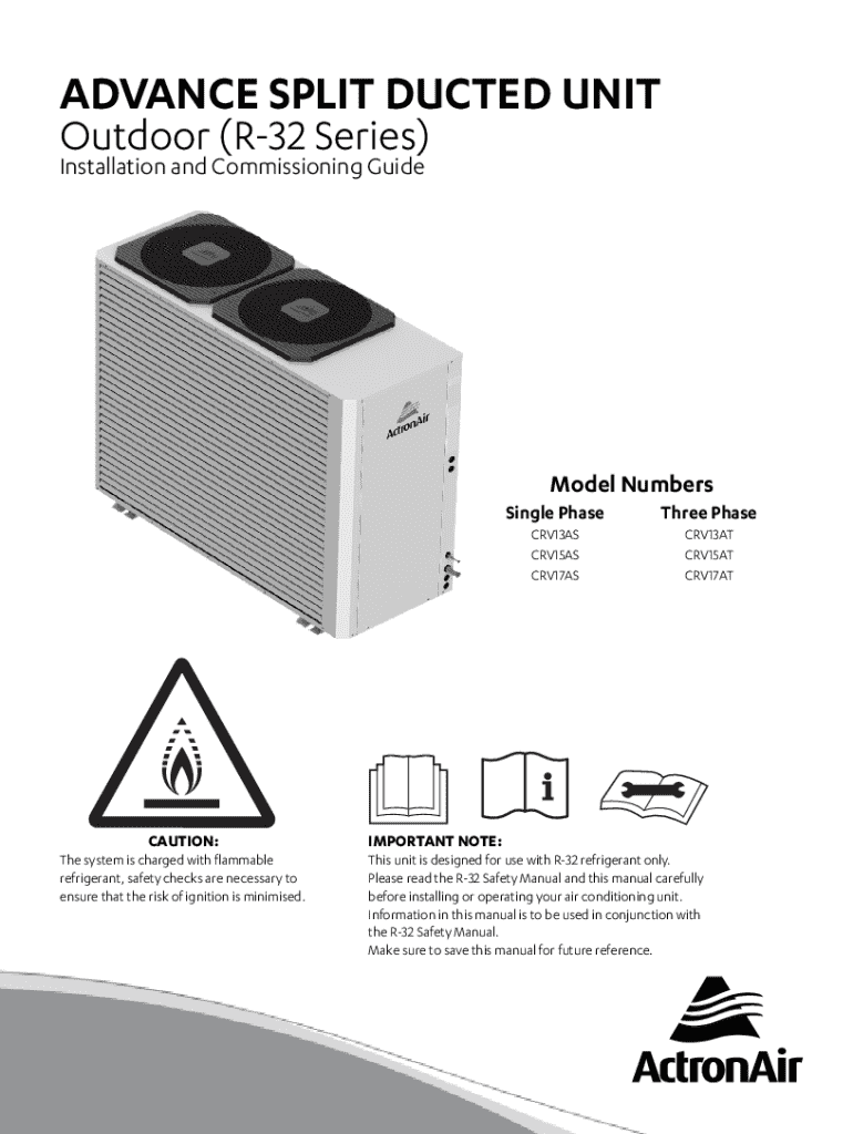 ADVANCE SPLIT DUCTED UNIT Outdoor (R32 Series) Installation and Commissioning GuideModel NumbersCAUTION: The system is charged with flammable refrigerant, safety checks are necessary to ensure that