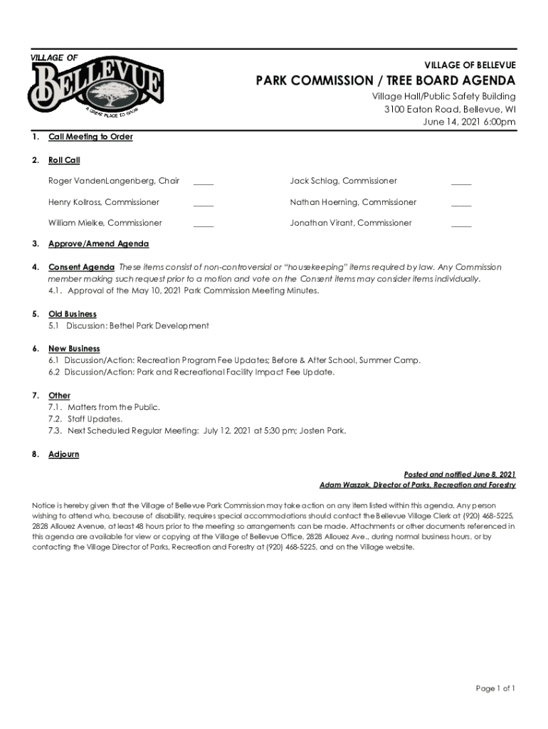 This document contains the agenda for the Village of Bellevue Park Commission and Tree Board meetings, including details about the location, date, time, attendees, agenda items, discussions on park development, recreation program fee updates, and other matters concerning the parks and recreational facilities in the Village.