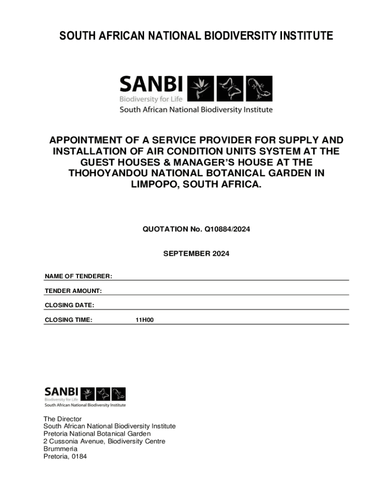 This document serves as a tender invitation from the South African National Biodiversity Institute for the provision of supply and installation services of air conditioning units at the guest houses and manager\'s house at Thohoyandou National Botanical Garden in Limpopo, South Africa. It outlines the requirements for submission, eligibility criteria, site inspection details, and compliance with relevant regulations.