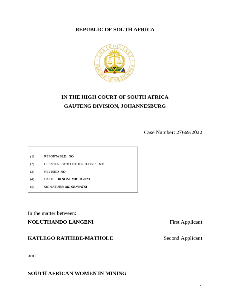 REPUBLIC OF SOUTH AFRICAIN THE HIGH COURT OF SOUTH AFRICA GAUTENG DIVISION, JOHANNESBURGCase Number: 27669/2022(1)REPORTABLE: NO(2)OF INTEREST TO OTHER JUDGES: NO(3)REVISED: NO(4)DATE:(5)SIGNATURE: