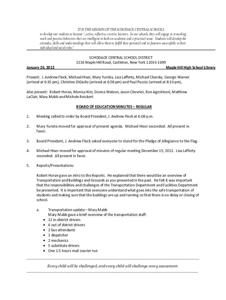 IT IS THE MISSION OF THE SCHODACK CENTRAL SCHOOLS to develop our students to become \"...active, reflective, creative learners. In our schools, they will engage in rewarding work and practice behaviors