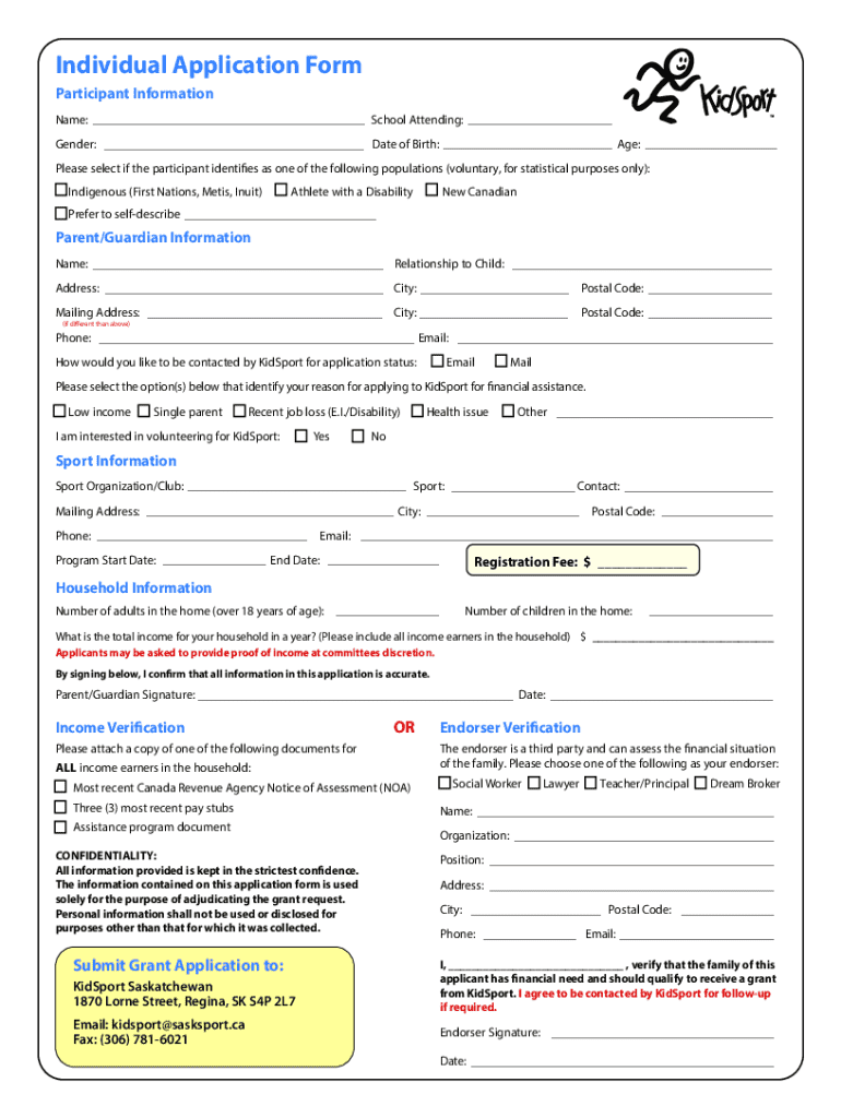 The KidSport Individual Application Form is designed for families facing financial obstacles to apply for financial support, enabling children and youth aged 5 to 18 to participate in recognized amateur sports. This application outlines eligibility criteria, coverage details, application procedures, and provides spaces for personal and household information to assess financial need.