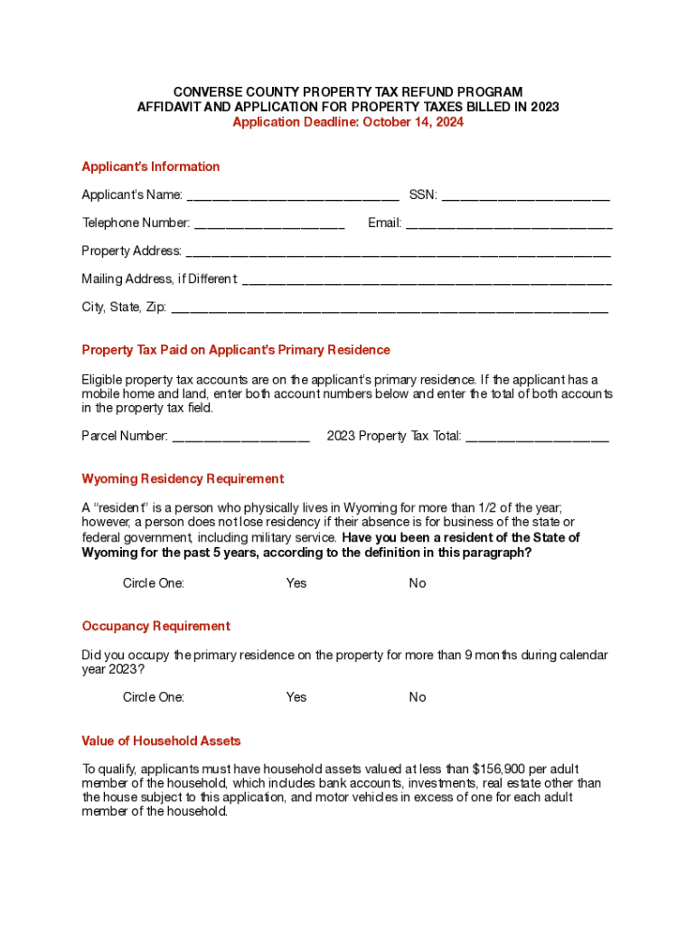 CONVERSE COUNTY PROPERTY TAX REFUND PROGRAM AFFIDAVIT AND APPLICATION FOR PROPERTY TAXES BILLED IN 2023 Application Deadline: October 14, 2024 Applicants Information Applicants Name: ___ SSN: ___