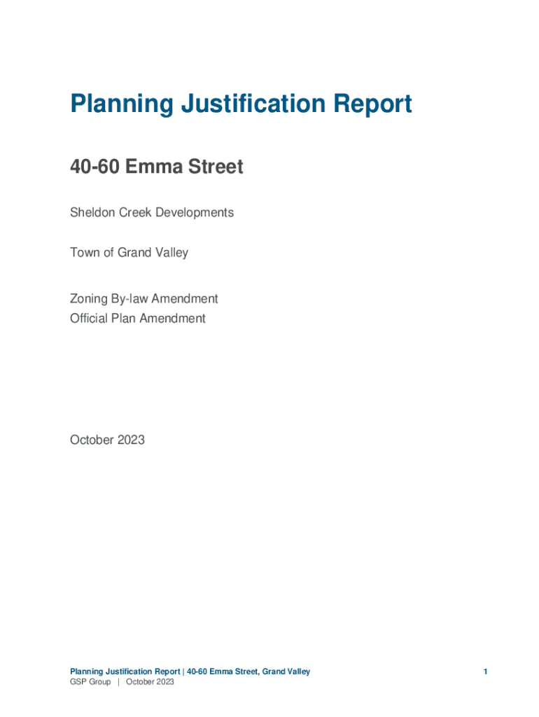 Planning Justification Report 4060 Emma Street Sheldon Creek Developments Town of Grand ValleyZoning Bylaw Amendment Official Plan AmendmentOctober 2023Planning Justification Report | 4060 Emma Street,