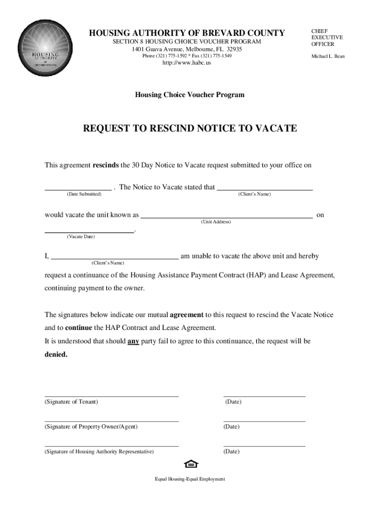 HOUSING AUTHORITY OF BREVARD COUNTY SECTION 8 HOUSING CHOICE VOUCHER PROGRAM 1401 Guava Avenue, Melbourne, FL 32935 Phone (321) 7751592 * Fax (321) 7751549CHIEF EXECUTIVE OFFICER Michael L. Beanhttp://www.habc.usHousing