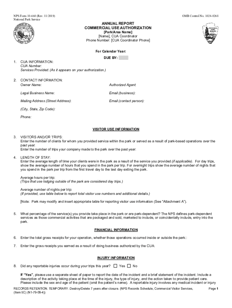 NPS Form 10660 (Rev. 11/2019) National Park ServiceOMB Control No. 10240268ANNUAL REPORT COMMERCIAL USE AUTHORIZATION [Park/Area Name] [Name], CUA Coordinator Phone Number: [CUA Coordinator Phone]