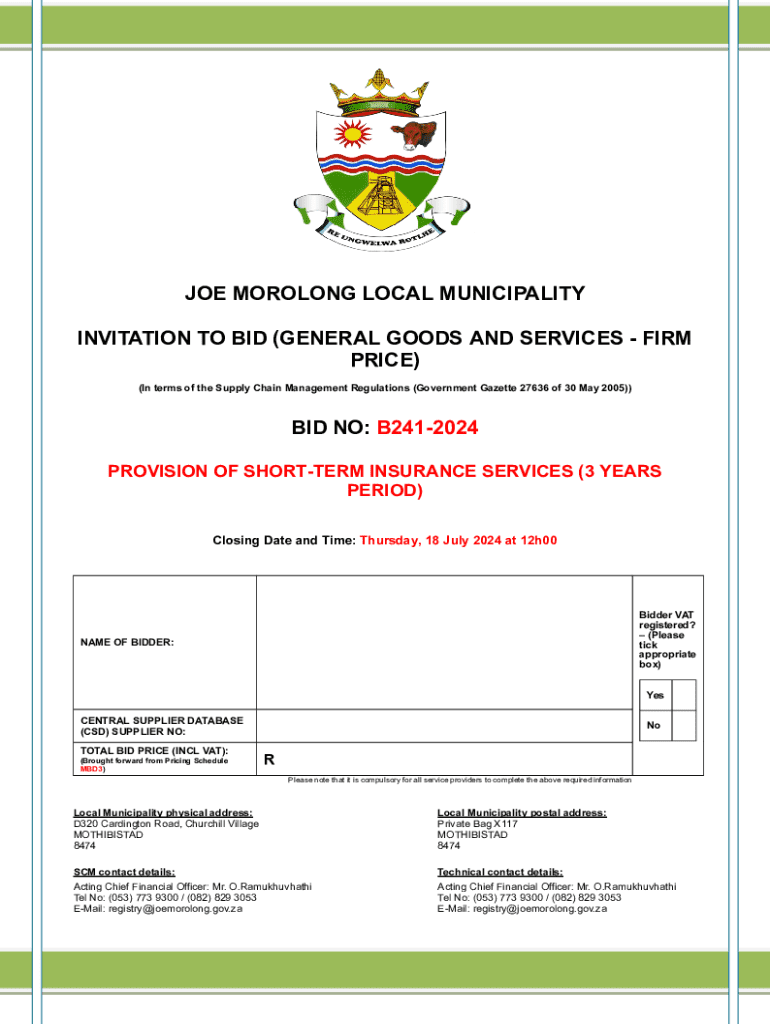 JOE MOROLONG LOCAL MUNICIPALITY INVITATION TO BID (GENERAL GOODS AND SERVICES FIRM PRICE) (In terms of the Supply Chain Management Regulations (Government Gazette 27636 of 30 May 2005))BID NO: B2412024