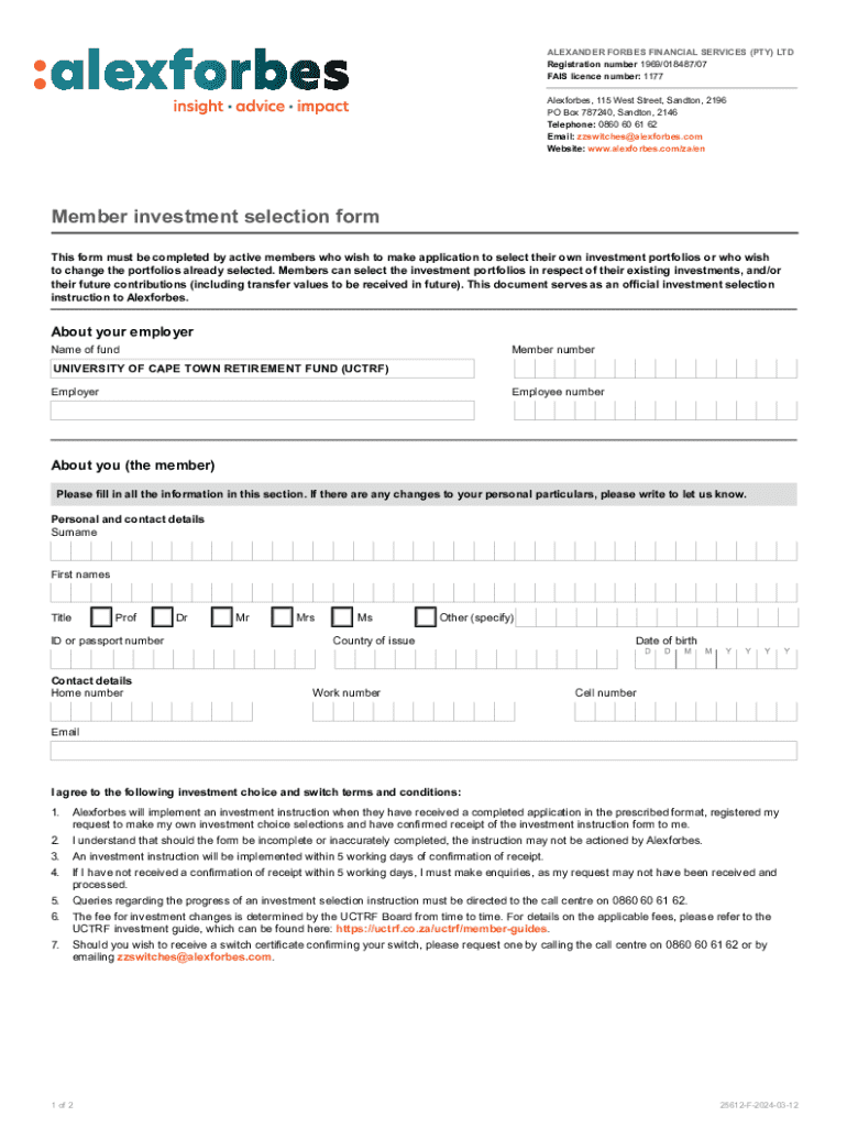 ALEXANDER FORBES FINANCIAL SERVICES (PTY) LTD Registration number 1969/018487/07 FAIS licence number: 1177 Alexforbes, 115 West Street, Sandton, 2196 PO Box 787240, Sandton, 2146 Telephone: 0860 60