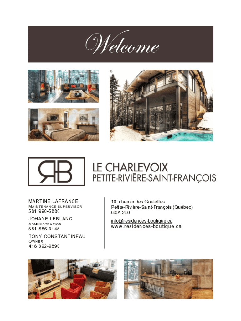 WelcomeM A R T IN E L A F R A N C E MAINTENA NCE SU PER VIS OR5 81 9 90 5 8 80 JO HA NE LE B L AN C ADMINIS TRA TION5 81 8 86 3 14 5 TONY CONSTANTINEAU OWNER4 18 3 92 9 89 010, chemin des Golettes