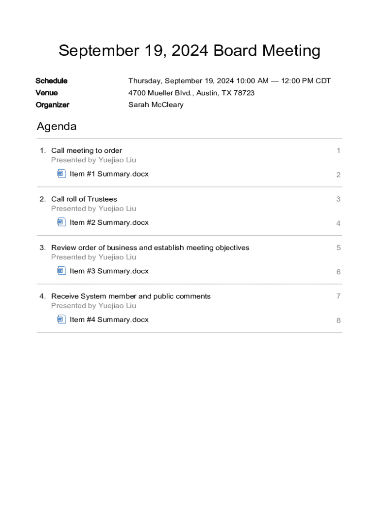 September 19, 2024 Board Meeting ScheduleThursday, September 19, 2024 10:00 AM 12:00 PM CDTVenue4700 Mueller Blvd., Austin, TX 78723OrganizerSarah McClearyAgenda 1. Call meeting to order Presented