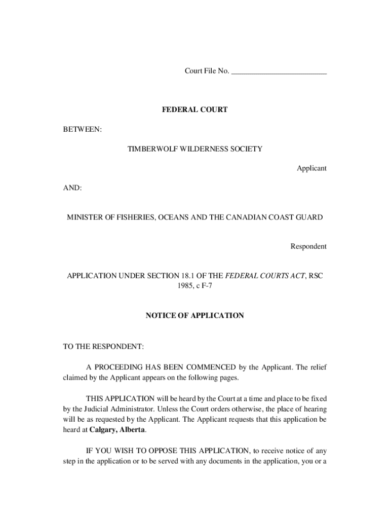 Court File No. ___FEDERAL COURT BETWEEN: TIMBERWOLF WILDERNESS SOCIETY Applicant AND:MINISTER OF FISHERIES, OCEANS AND THE CANADIAN COAST GUARDRespondentAPPLICATION UNDER SECTION 18.1 OF THE FEDERAL