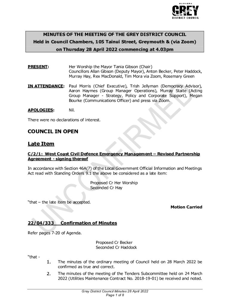 MINUTES OF THE MEETING OF THE GREY DISTRICT COUNCIL Held in Council Chambers, 105 Tainui Street, Greymouth & (via Zoom) on Thursday 28 April 2022 commencing at 4.03pmPRESENT:Her Worship the Mayor