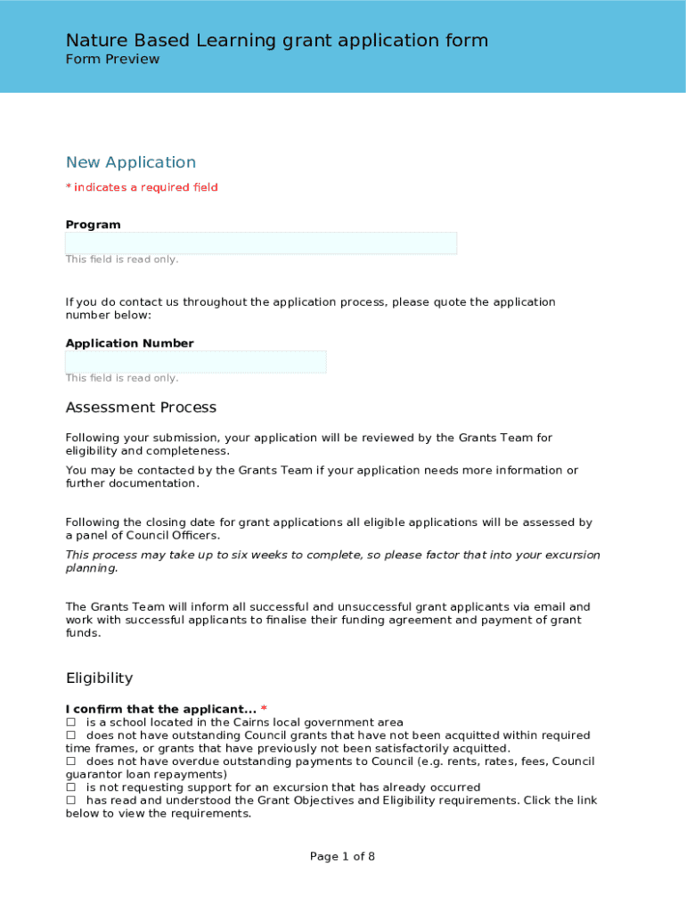 This form is for schools located in the Cairns local government area to apply for a grant to support excursions related to nature-based learning. The application includes sections for applicant details, excursion details, financial information, and necessary supporting documentation.
