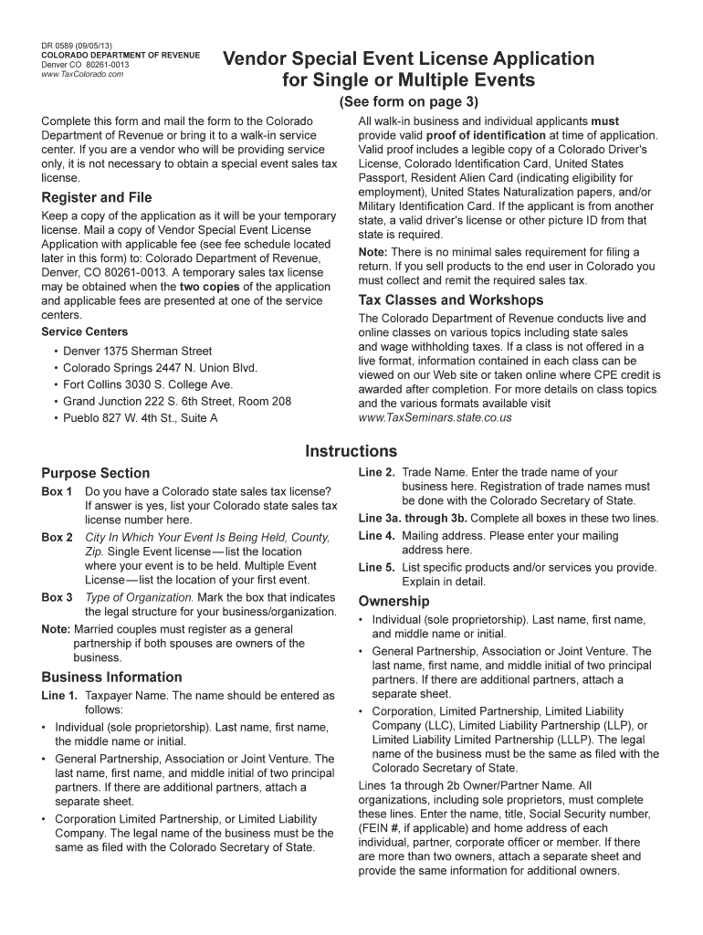 DR 0589 (11/24/09) Web Colorado department of revenue Denver CO 80261-0009 (303) 238-SeRv(7378) vendor special event license application for single or multiple events if you need assistance with the
