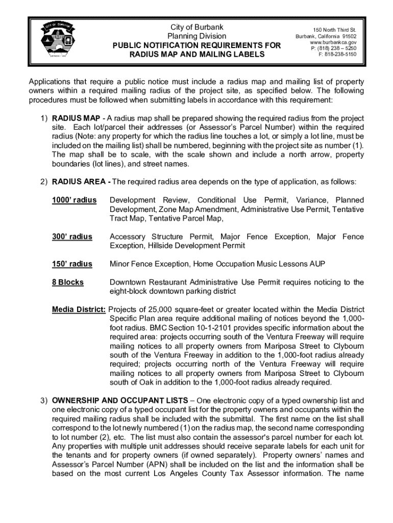 City of Burbank Planning Division PUBLIC NOTIFICATION REQUIREMENTS FOR RADIUS MAP AND MAILING LABELS150 North Third St. Burbank, California 91502 www.burbankca.gov P: (818) 238 5250 F: 8182385150Applications