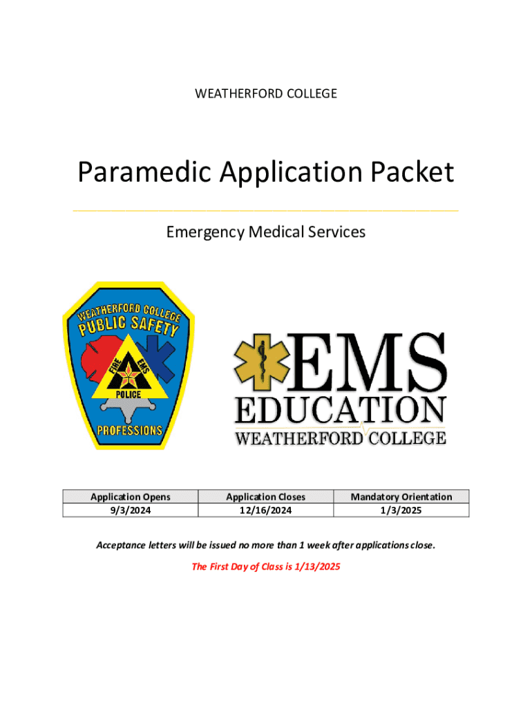 WEATHERFORD COLLEGEParamedic Application Packet ___Emergency Medical ServicesApplication Opens 9/3/2024Application Closes 12/16/2024Mandatory Orientation 1/3/2025Acceptance letters will be issued