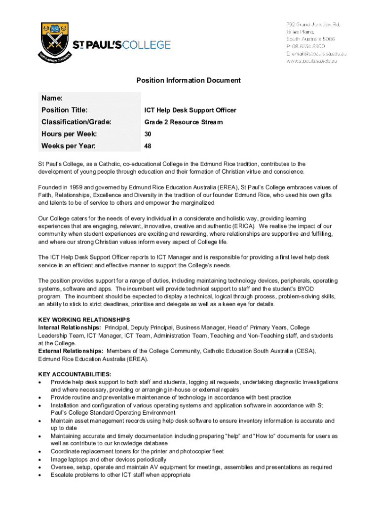 Get the free Position Title: - ICT Help Desk Support Officer - St Paul's College