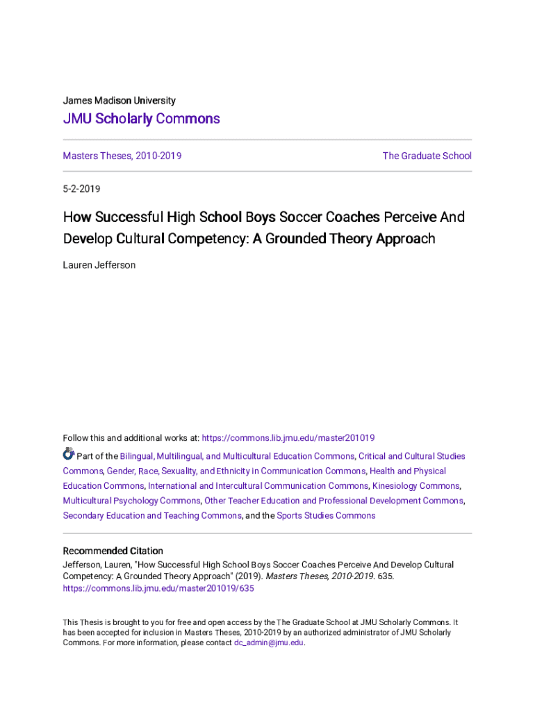 James Madison UniversityJMU Scholarly Commons Masters Theses, 20102019The Graduate School522019How Successful High School Boys Soccer Coaches Perceive And Develop Cultural Competency: A Grounded Theory