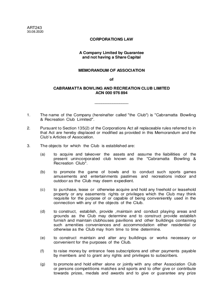 Get the free Cabramatta Bowling and Recreation Club Limited - Memorandum and Articles of Association
