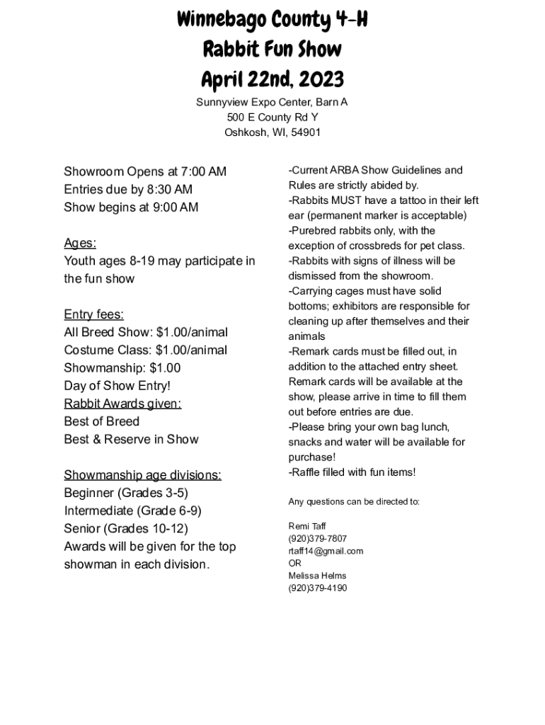 Join the Winnebago County 4-H Rabbit Fun Show at Sunnyview Expo Center on April 22nd, 2023. This event is open to youth aged 8-19 and features various awards for Best of Breed, Showmanship, and costume classes. Participants must follow ARBA Show Guidelines and there is a nominal entry fee for each animal. Be sure to bring your own lunch and enjoy a fun-filled day with raffles and awards.