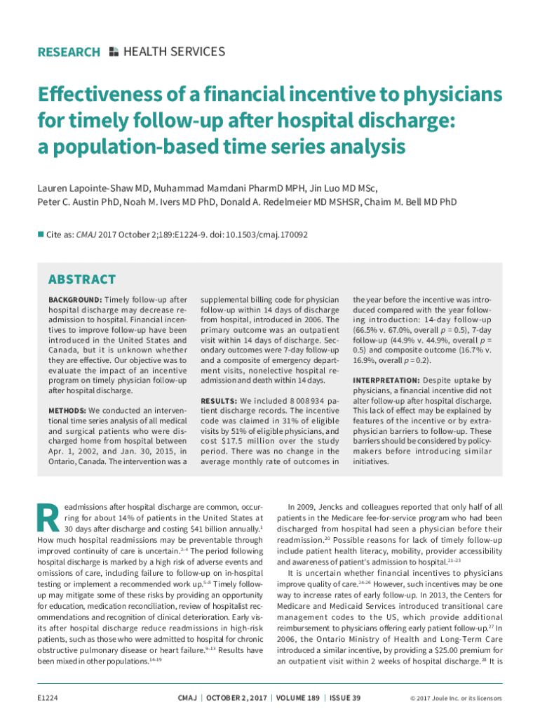 RESEARCHHEALTH SERVICESEffectiveness of a financial incentive to physicians for timely followup after hospital discharge: a populationbased time series analysis Lauren LapointeShaw MD, Muhammad Mamdani