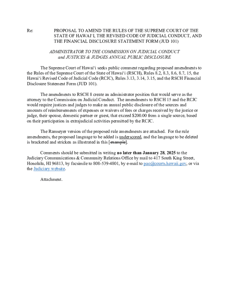 This document outlines proposed amendments to the rules governing the Supreme Court of Hawaiʻi, including the establishment of an administrator position for the Commission on Judicial Conduct, mandatory annual public disclosures for justices and judges, and revisions to the Judicial Code of Conduct related to the acceptance and reporting of gifts, loans, and reimbursements.