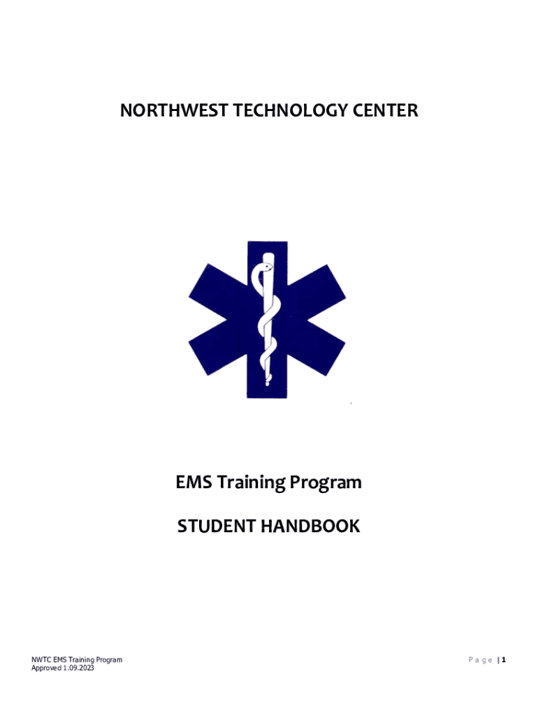 This handbook outlines the program requirements, policies, and procedures for students enrolled in the Northwest Technology Center EMS Training Program. It includes information on admission requirements, grading policies, ethical standards, and operational guidelines.