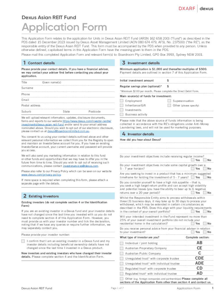 Dexus Asian REIT FundApplication Form This Application Form relates to the application for Units in Dexus Asian REIT Fund (ARSN 162 658 200) (\"Fund\") as described in the PDS dated 15 December 2023
