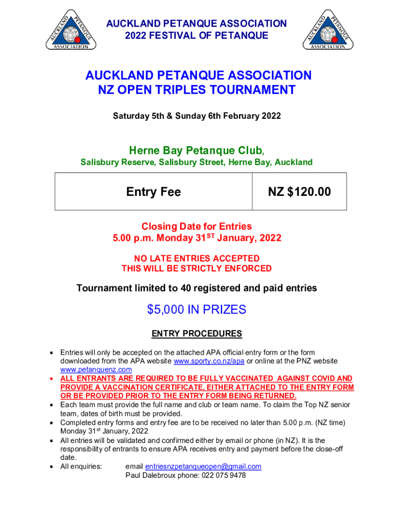 This document provides information and an entry form for the Auckland Petanque Association\'s NZ Open Triples Tournament held on February 5th and 6th, 2022. It outlines the tournament\'s rules, entry procedures, fee details, format, and contact information for inquiries.