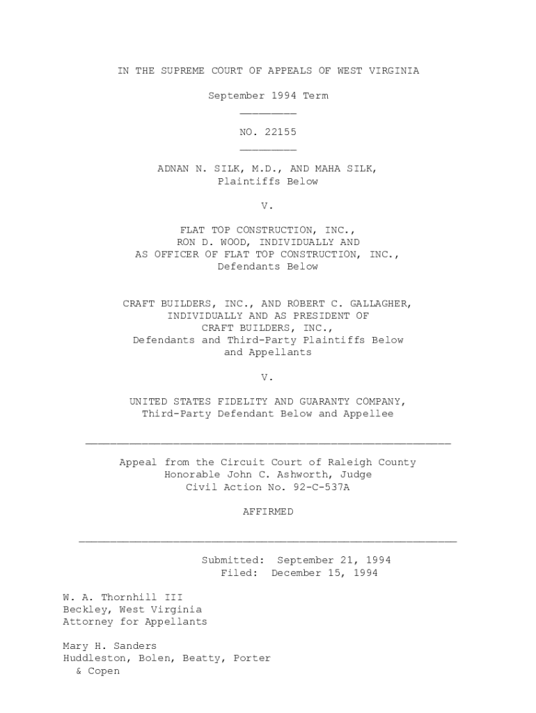 IN THE SUPREME COURT OF APPEALS OF WEST VIRGINIA September 1994 Term ___ NO. 22155 ___ ADNAN N. SILK, M.D., AND MAHA SILK, Plaintiffs Below V. FLAT TOP CONSTRUCTION, INC., RON D. WOOD, INDIVIDUALLY