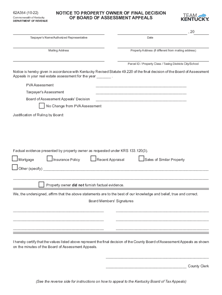 This document serves as a formal notice to property owners regarding the final decision made by the Board of Assessment Appeals on their real estate assessment. It includes space for both the PVA and taxpayer assessments, the Board\'s decision, and justifications based on factual evidence submitted by the property owner. Additionally, it provides instructions for appealing the decision if the owner is dissatisfied.