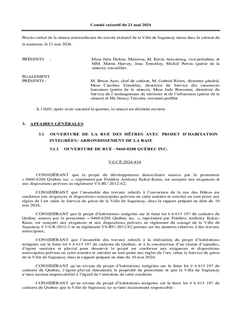 Comit excutif du 21 mai 2024 Procsverbal de la sance extraordinaire du comit excutif de la Ville de Saguenay tenue dans le cabinet de la mairesse, le 21 mai 2024.PRSENTS:Mme Julie Dufour, Mairesse,