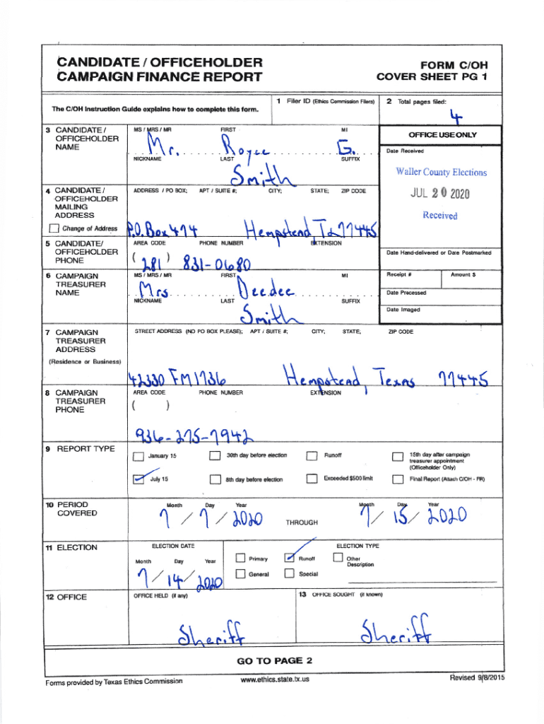 CANDIDATE / OFFICEHOLDER CAMPAIGN FINANCE REPORT The C/OH lrBt uc0,o]r3CANDIDATE/OFFICEHOLDER NAMECANDIDATE /1 File.lDGdd. opLlrE lros to contpad. lls torm.(EcCdrrris.b.r Fa.s)*\'W.Atx)qESi, PO2Tobl