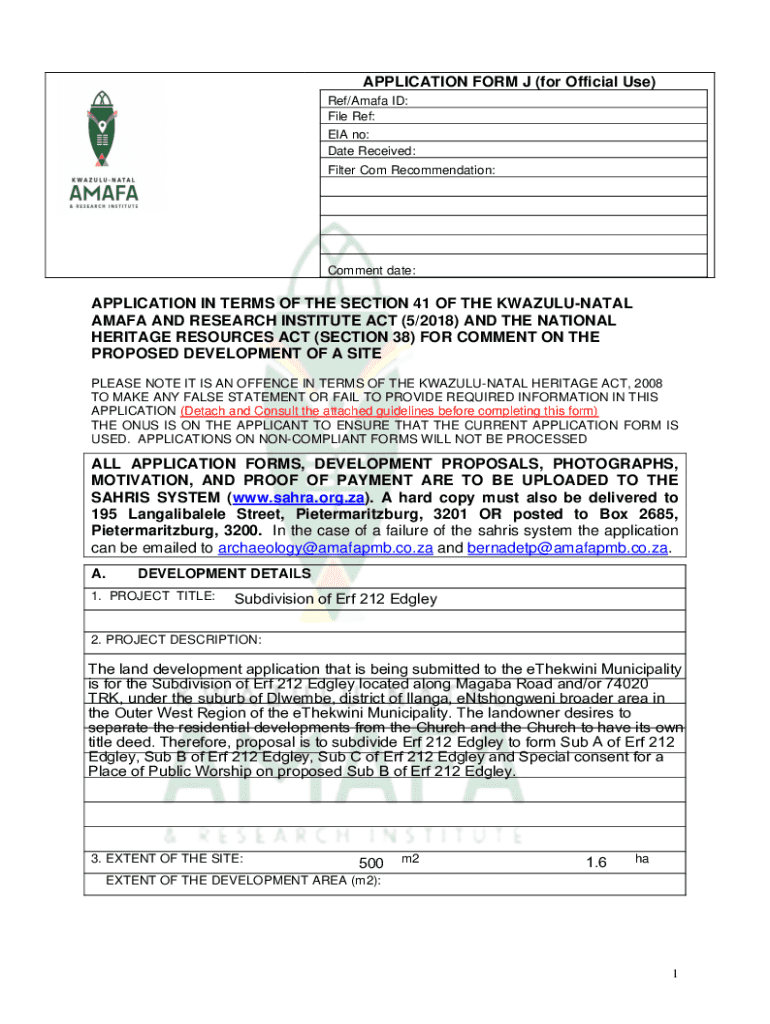 APPLICATION FORM J (for Official Use) Ref/Amafa ID: File Ref: EIA no: Date Received: Filter Com Recommendation:Comment date:APPLICATION IN TERMS OF THE SECTION 41 OF THE KWAZULUNATAL AMAFA AND RESEARCH