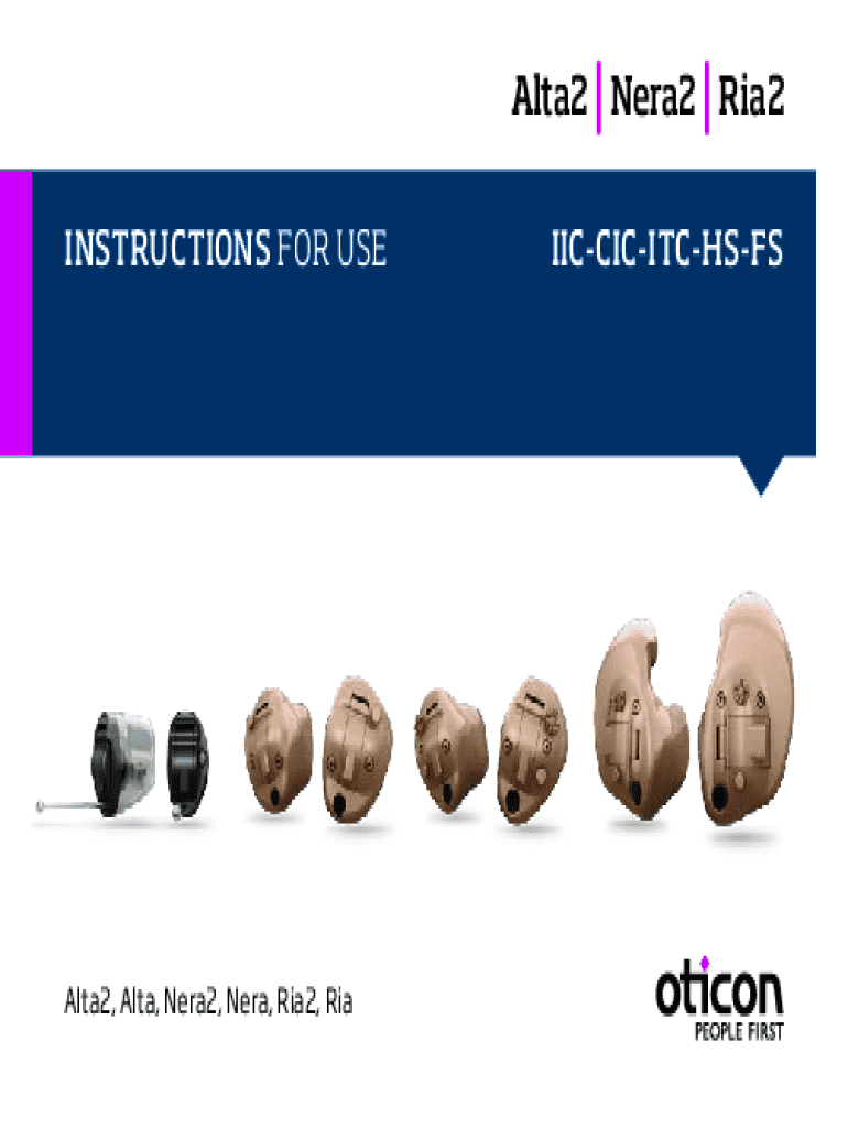 Alta2 Nera2 Ria2 INSTRUCTIONS FOR USEAlta2, Alta, Nera2, Nera, Ria2, RiaIICCICITCHSFSIntroduction to this bookletIndication for useThis booklet guides you in how to use and maintain your new hearing