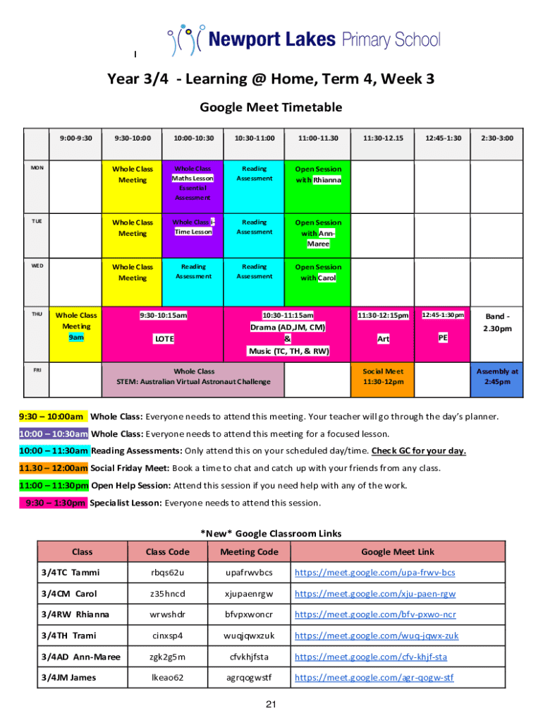 lYear 3/4 Learning @ Home, Term 4, Week 3 Google Meet Timetable 9:009:309:3010:0010:0010:3010:3011:0011:0011.30MONWhole Class MeetingWhole Class Maths Lesson Essential AssessmentReading AssessmentOpen