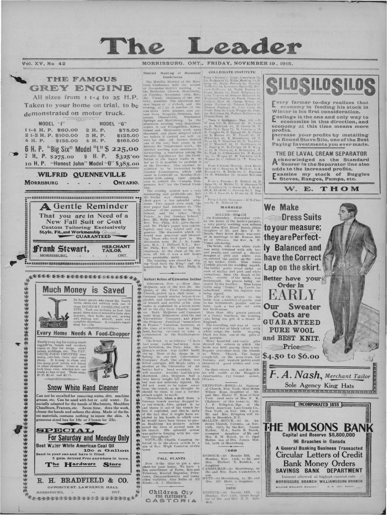 ader MORRISBURG. ONT .. FRIDAY, NOVEMBER 19, 1915.Vol. XV, No 42IDistrictTHE FAMOUM::;;::e::e MontrealF11r.:o:AT:z::s:e1:: 7;3,IIL\'h M ild ff t. t f h 1iI J 1,. B,cksteal 7\'1., Wilda Merkley ,o,