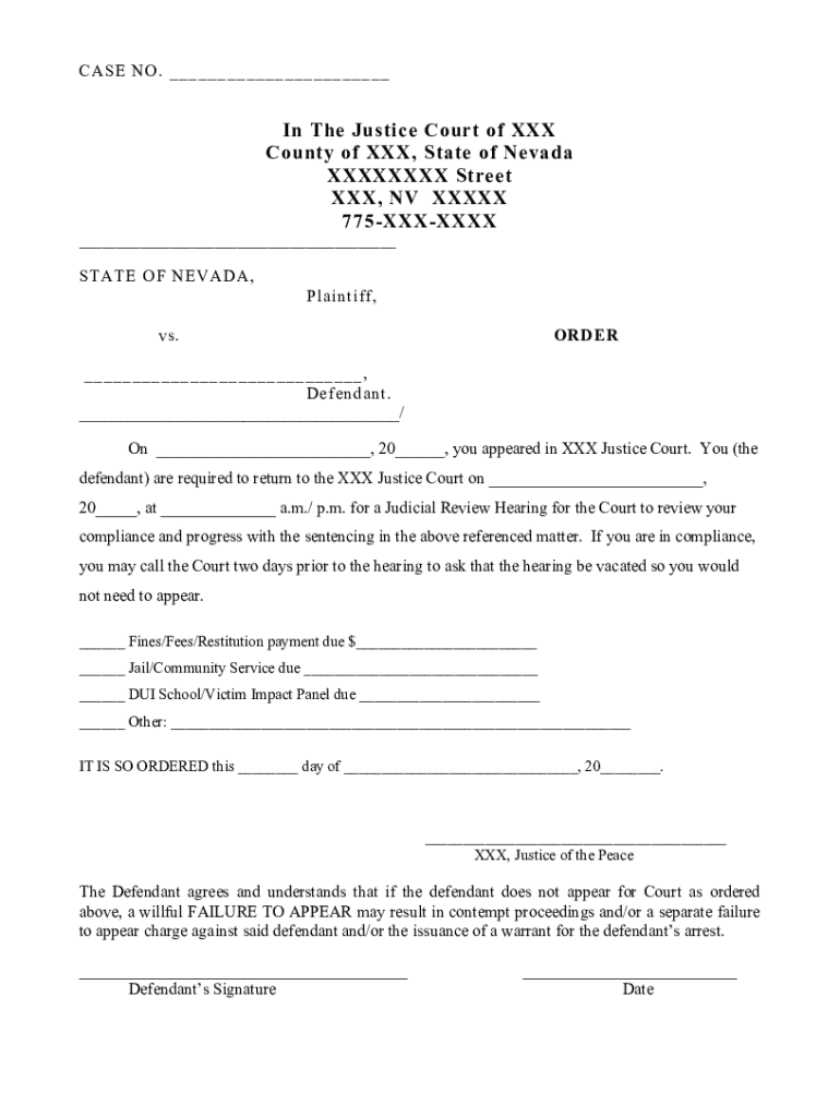 CASE NO. ___In The Justice Court of XXX County of XXX, State of Nevada XXXXXXXX Street XXX, NV XXXXX 775XXXXXXX ___STATE OF NEVADA, Plaintiff, vs.ORDE R___, Defendant . ___/ On ___, 20___, you appeared