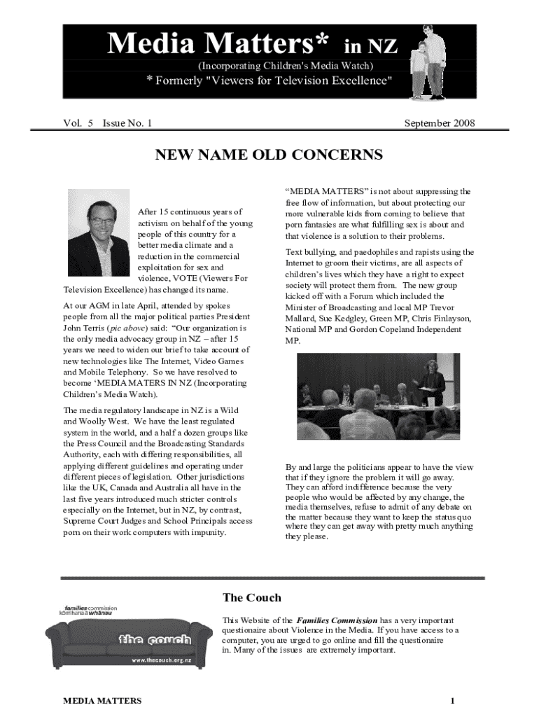 (Incorporating Children\'s Media Watch)* Formerly \"Viewers for Television Excellence\" Vol. 5 Issue No. 1September 2008NEW NAME OLD CONCERNSAfter 15 continuous years of activism on behalf of the