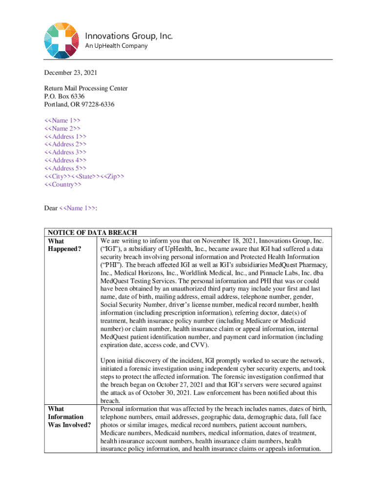 This document serves as a notification to affected individuals regarding a data breach that occurred on November 18, 2021, which involved unauthorized access to personal and Protected Health Information. The notice outlines the nature of the breach, types of information potentially compromised, steps taken by the organization to address the incident, and recommendations for individuals to protect their identity.