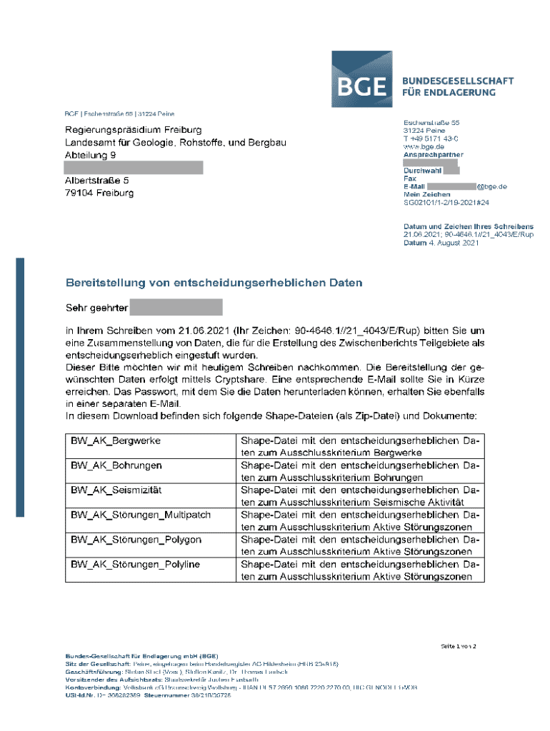 BGE | Eschenstrae 55 | 31224 PeineRegierungsprsidium Freiburg Landesamt fr Geologie, Rohstoffe, und Bergbau Abteilung 9Eschenstrae 55 31224 Peine T +49 5171 430 www.bge.de Ansprechpartner Durchwahl