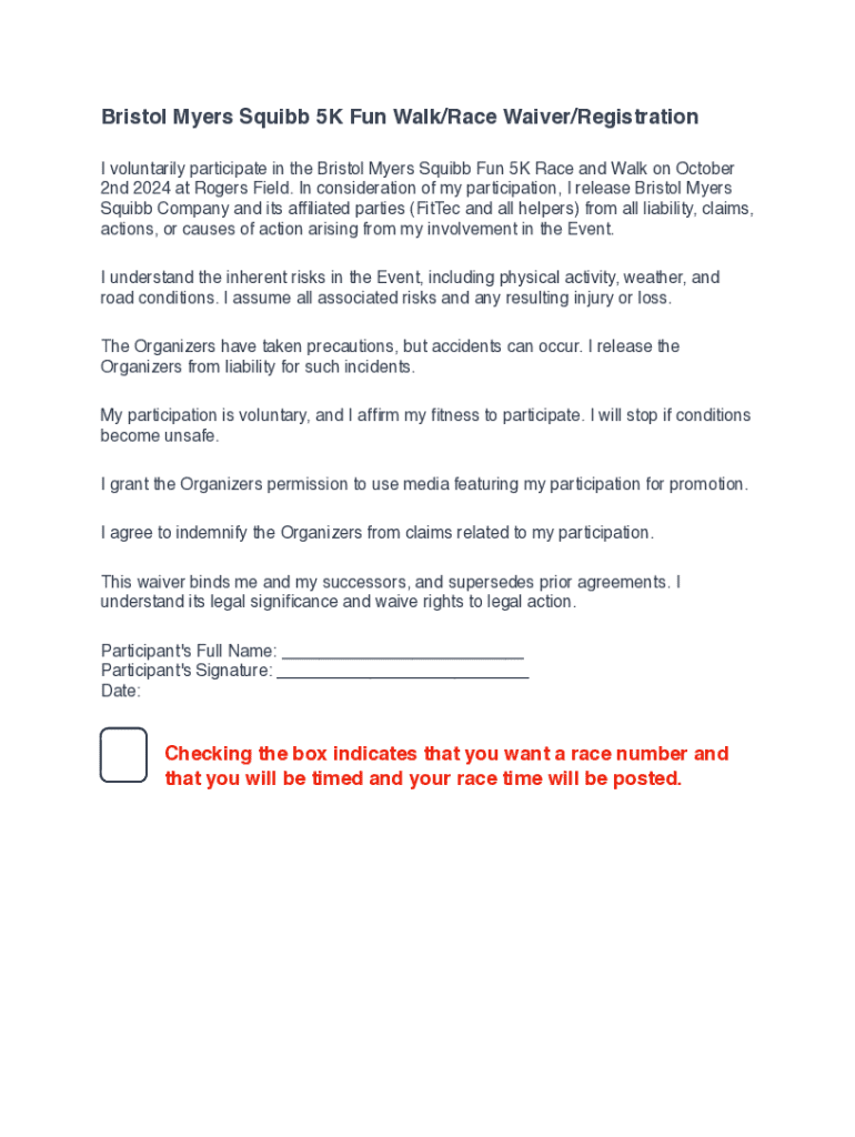 Bristol Myers Squibb 5K Fun Walk/Race Waiver/Registration I voluntarily participate in the Bristol Myers Squibb Fun 5K Race and Walk on October 2nd 2024 at Rogers Field. In consideration of my participation,