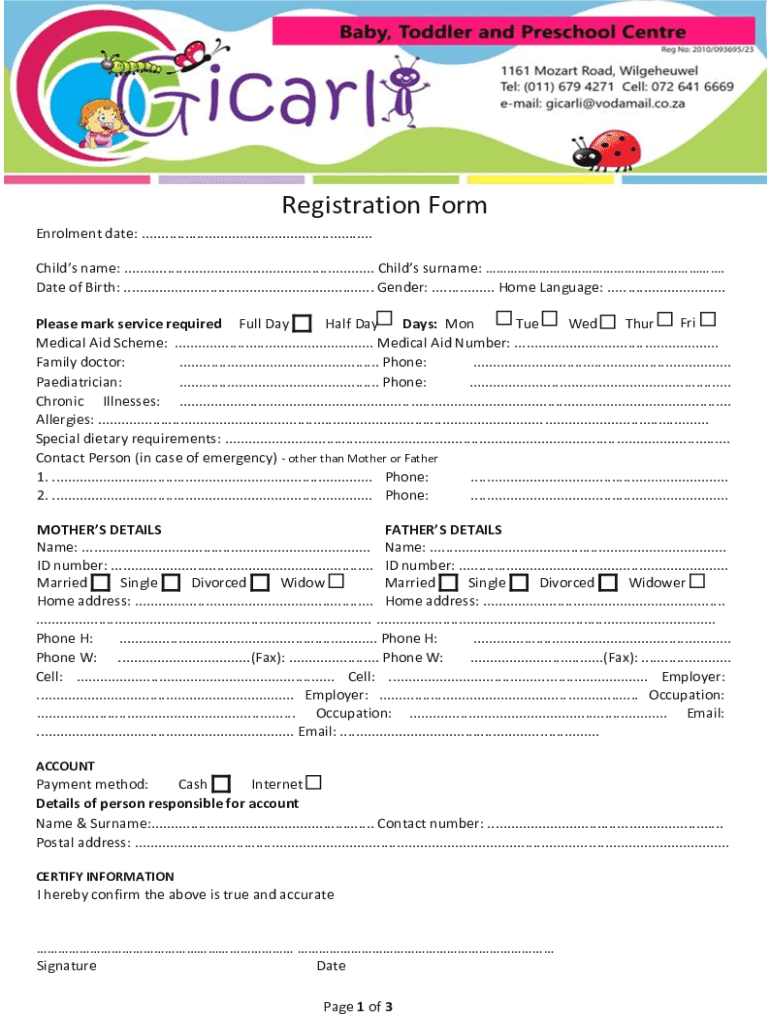 Registration Form Enrolment date: ........................................................... Childs name: ................................................................ Childs surname: . Date of