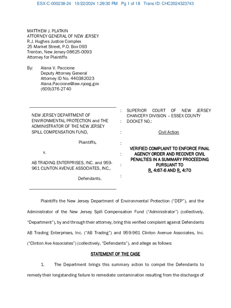 This document is a verified complaint filed by the New Jersey Department of Environmental Protection and the Administrator of the New Jersey Spill Compensation Fund against AB Trading Enterprises, Inc. and 959-961 Clinton Avenue Associates, Inc., seeking enforcement of a final agency order (FAO) to remediate hazardous contamination on a site owned by the defendants. The complaint outlines the defendants\' failure to comply with various environmental statutes and seeks civil penalties for...